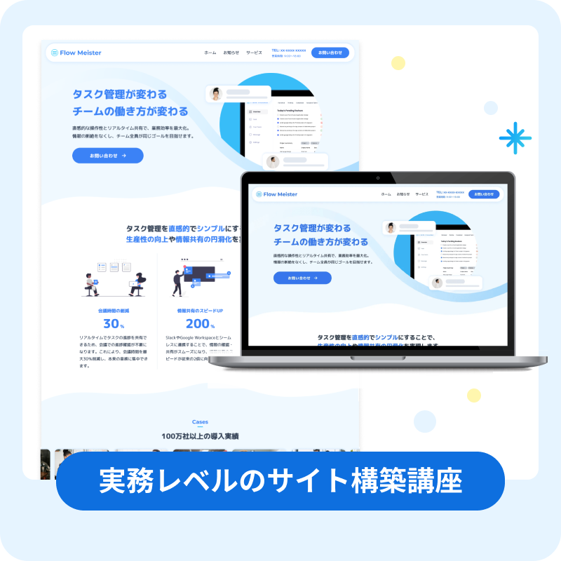 タスクを分割しながら実際の現場での動きに近い形で進めていくので、サイトを構築するスキルを獲得すると同時に、プロジェクト進行の流れも自然と身についていきます。