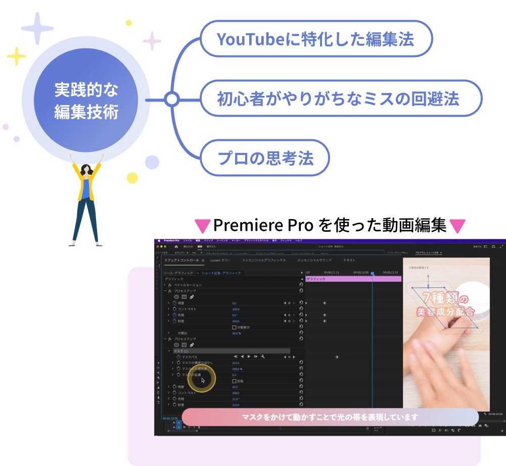 YouTubeに特化した編集法に加え、初心者がやりがちなミスの回避法、そして“プロの思考法”も学べるため、即戦力レベルの洗練された動画編集スキルを身につけていきます。